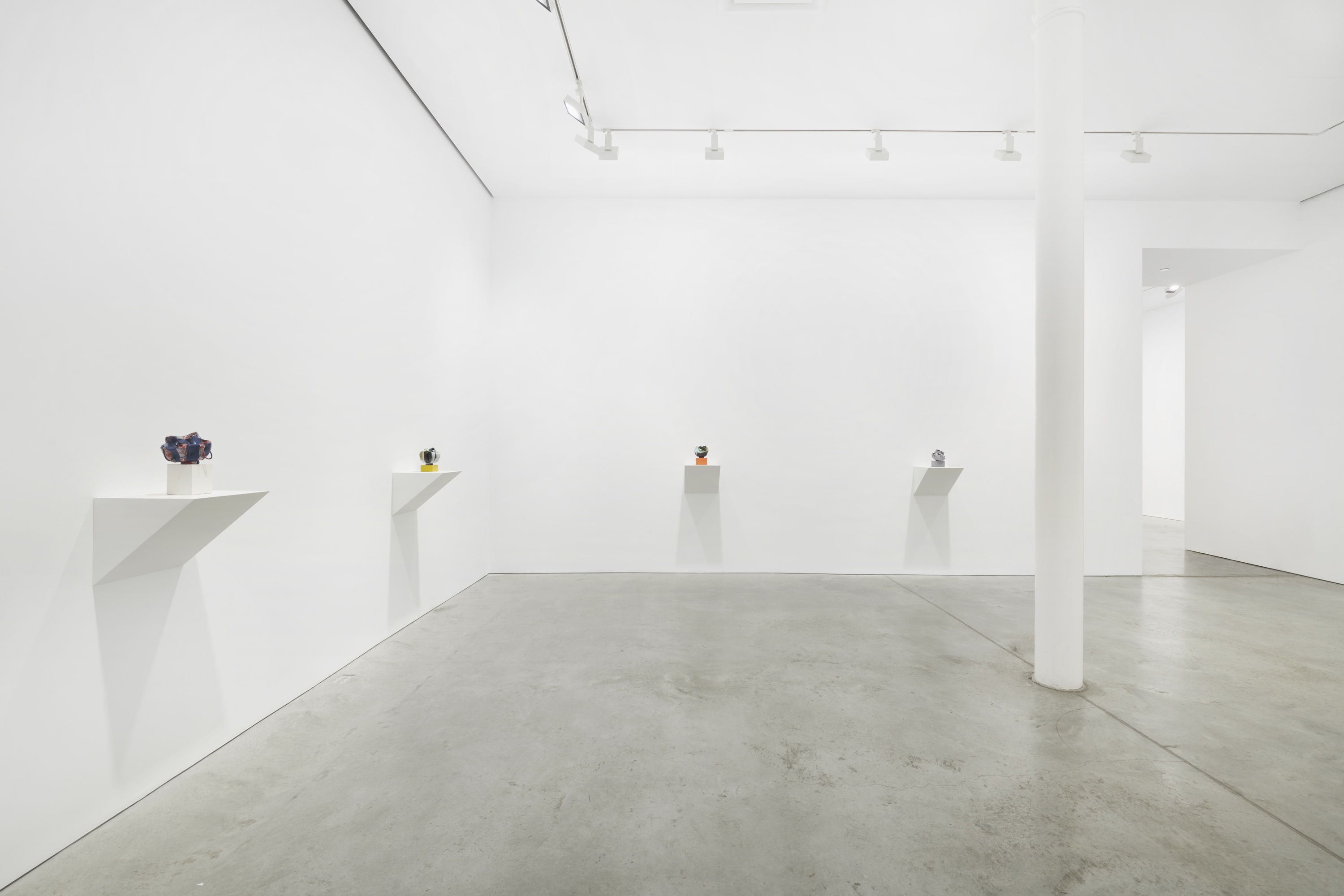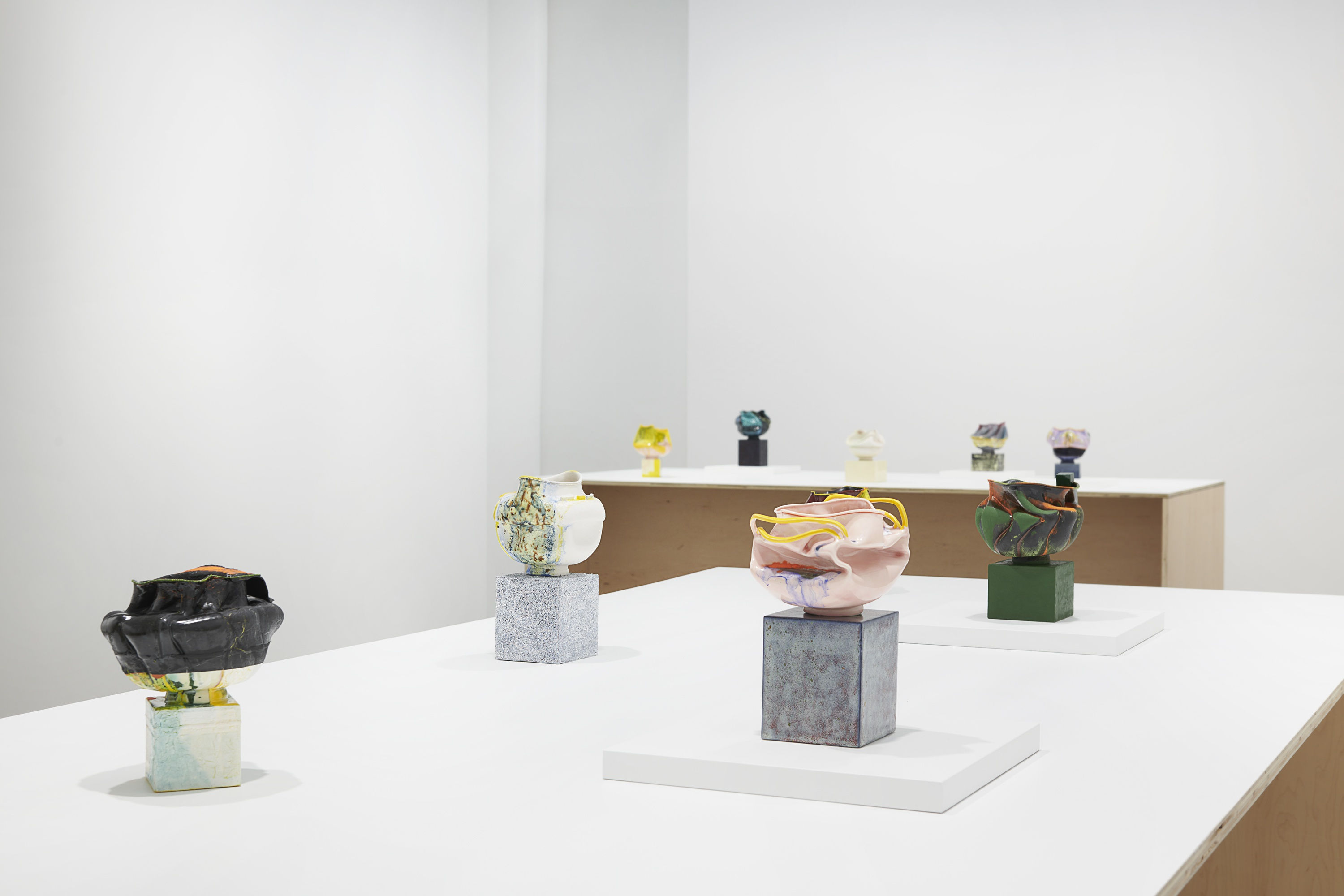 All the works in this exhibition begin as a single cast form originating from a store-bought fishbowl, akin to a readymade. Butterly pours wet porcelain clay into a plaster mold, manipulating the unfired clay by pinching, pulling, folding, and carving, until she feels the work’s distinct form and personality emerge.