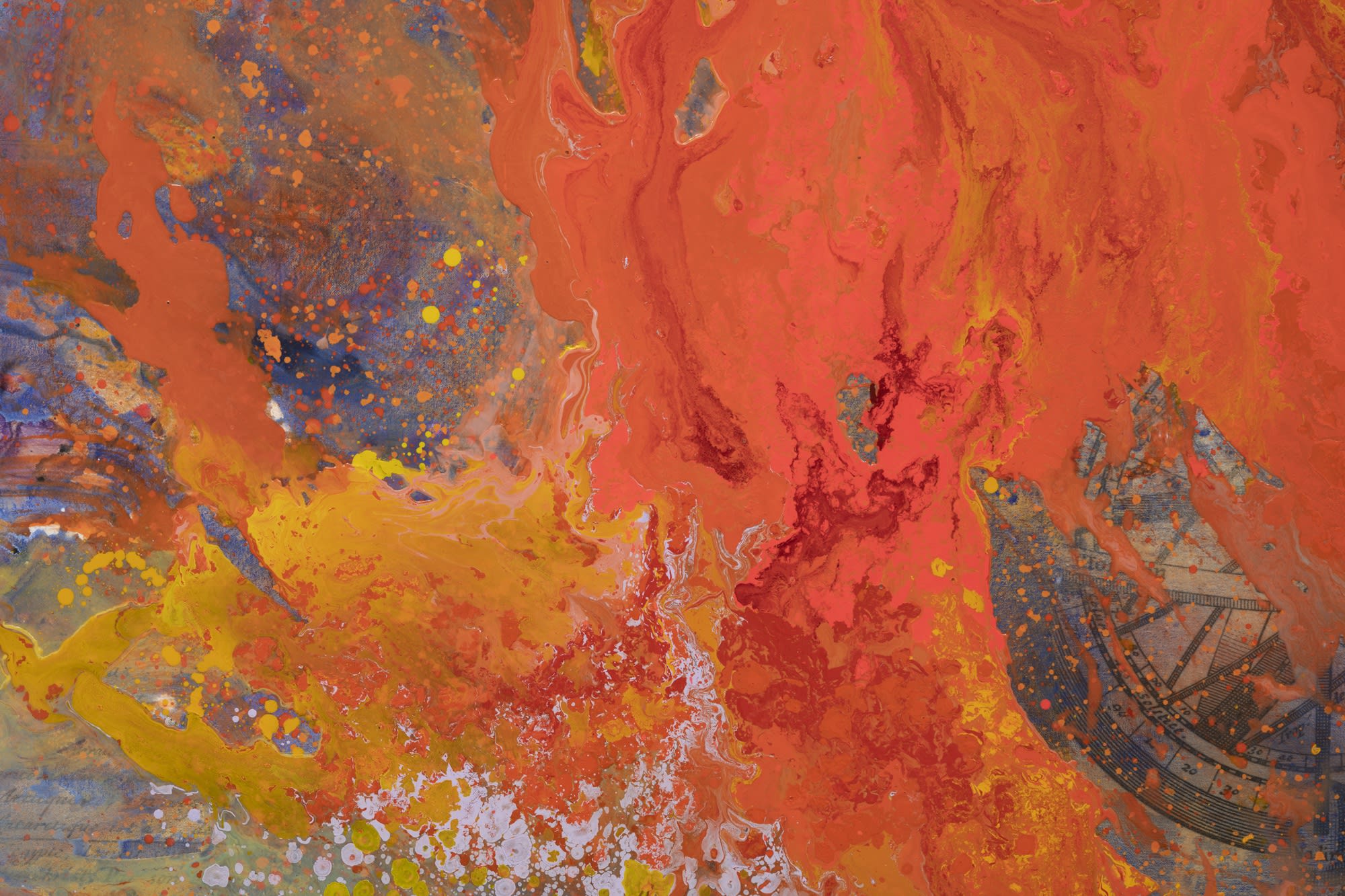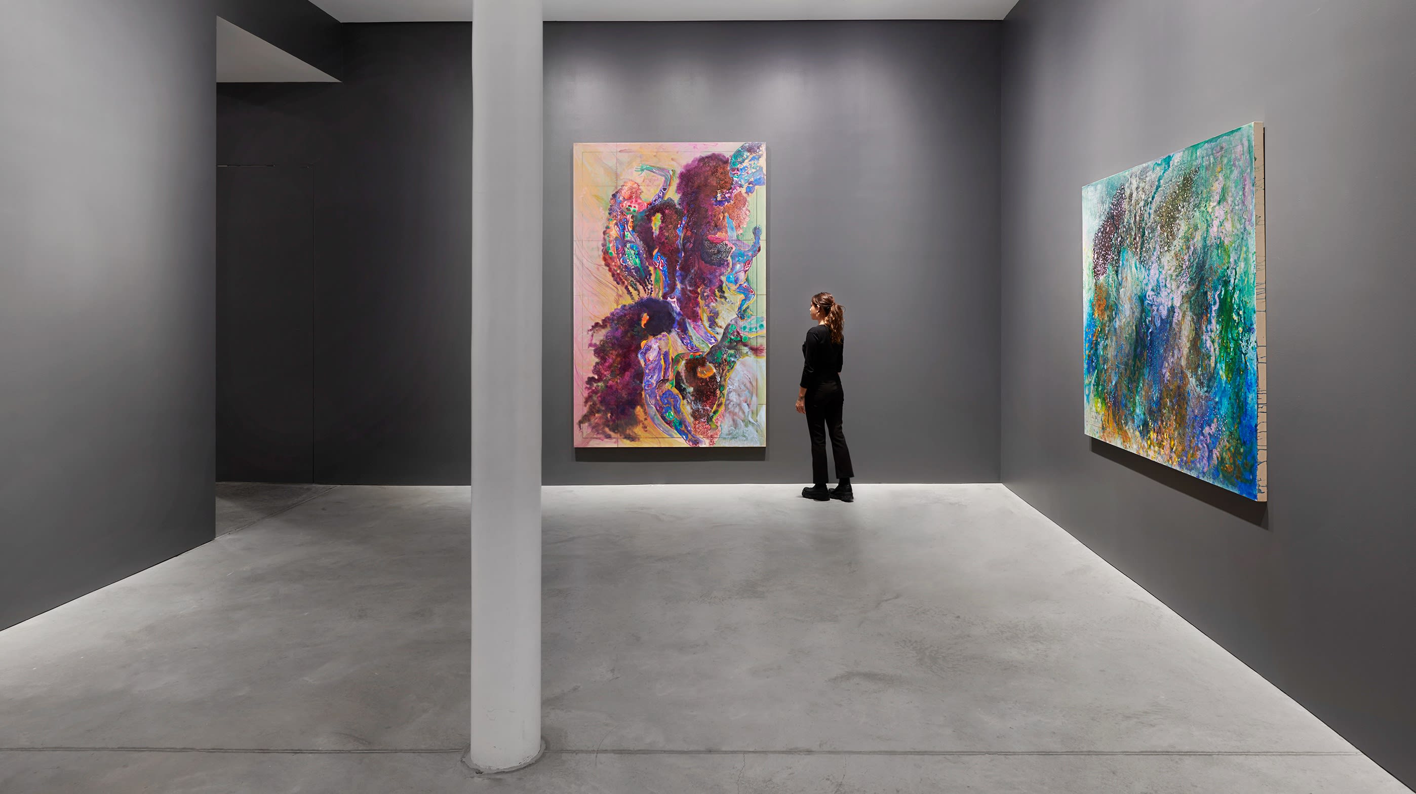 For Báez, abstraction is born out of a virtuosic handling of alchemical pours of paint and an essential understanding of gesture as form. The body is inextricably tied to these highly physical maneuvers, which function on the one hand as a kind of obliteration, and on the other, a tender ablution.